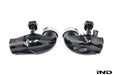 Presenting the perfect addition to our G9X M5 intake system to optimize the flow path all the way to the turbos. The OEM inlets exhibit a reduction in diameter immediately downstream of the intake connection, which can restrict airflow, particularly at elevated boost pressures. Our carbon fiber inlets address this restriction by maintaining a consistent, larger cross-sectional area and therefore there is a larger captured volume of air directly in front of the turbos. Furthermore, the curvature of the inlets has been optimized to minimize flow resistance, promoting smoother airflow to the turbochargers. Made from prepreg carbon fiber with CNC machined flanges, the inlets also provide an aesthetic improvement to the engine bay.
