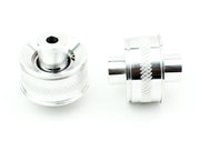 Front Caster Rod Bushings (CRB) replace the stock flexible rubber bushings with low friction, articulating Spherical Bearings eliminating bushing deflection and reducing friction. This maintains optimum suspension geometry under load to improve braking and handling feedback. Massive 1" sized FK Racing Bearings with self lubricating Teflon liners are used to ensure maximum performance and durability. Innovative CNC machined offset bearing spacers provide +/- 2 degrees of caster adjustment. OEM arms not included. Sold as a pair. Made in the USA.