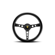 Prototipo is the ideal choice for classic vehicles of all generations. At 350mm diameter, and NEW 370mm, the unique, timeless design is the perfect choice for both long driving trips or a performance GT car. The iconic holes in your choice of black or silver spokes make this black leather-gripped steering wheel lighter to handle. The hand-sewn parallel white stitching runs the perimeter of the entire steering wheel. The laser-engraved ”Prototipo” on the spokes and yellow MOMO logo on the embossed horn button provide the ultimate finishing details of this classic MOMO steering wheel. New 370mm Diameter available to order February 10th.