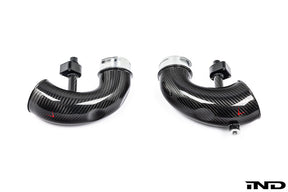 Presenting the perfect addition to our X5M, XM intake system to optimize the flow path all the way to the turbos. Our carbon inlets have a larger volume than the stock inlets by maintaining a larger diameter all the way to the turbos. The stock inlets narrow down immediately after the connection to the intake which creates a restriction especially at higher boost levels. We have alleviated this restriction and also designed the curvature to be as smooth as possible allowing the turbos to function with reduced resistance. Made from prepreg carbon fiber with CNC machined flanges, the inlets also provide an aesthetic improvement to the engine bay.