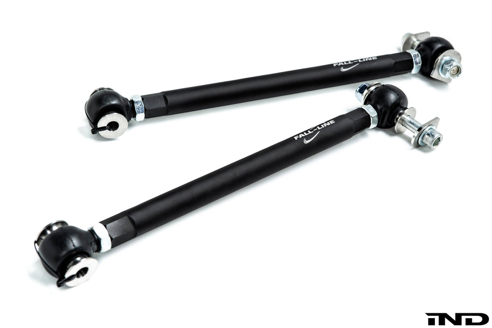 The standard toe link kit by Fall Line Motorsports is designed to facilitate rapid adjustments of toe during an alignment, and combined with the tension strut will also enable adjustment of overall track. Not only does this allow for fine tuning of wheel fitment, these arms will allow an alignment shop to make quick work of car setup, even simplifying the camber adjustment process as a result.