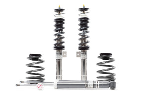 H&R'street Performance SS Coil Overs feature polished stainless steel shock tubes. These Coil Overs are shock damping adjustable-allowing personalized tuning of the shock setting to suit driving needs for high performance or comfort. The fully threaded shock body allows for adjustable vehicle height. H&R ride development engineers have precisely plotted the perfect shock damping curves of each application for optimized handling and superb ride comfort. To ensure the best quality available H&R has partnered with world-renowned shock specialists, KONI, to manufacture these high quality shocks.