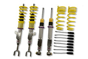 KW V2 INOX-LINE coilovers are the perfect solution for drivers who want more than just outstanding looks and adjustable ride height. In addition to stainless steel coilover struts, and corrosion-resistant components built for long term durability, KW V2 coilovers utilize TVR-A (Twin Valve Rebound - Adjustable) technology that allow Adjustment of the rebound damping characteristics with 16 clicks so you can fine tune the ride comfort or performance to your satisfaction. As with all KW coilovers our engineers develop vehicle specific damper settings that undergo comprehensive testing on the Nurburgring Nordschleife and in our KW 7-post Driving Dynamic Test Center. With a KW coilover kit the driving experience is more dynamic and direct. With the rebound adjustability you have a more direct influence on the handling or comfort of the car. With 16 precise clicks you can adjust the KW dampers (more firm or more comfortable) without affecting the compression damping fine-tuned by our engineers. The two-stage, patented TVR-A (Twin Valve Rebound - Adjustable) technology enables a small volume of oil flow through an adjustable, conically shaped, low-speed bypass during low damper speeds, while at high damper speeds, the main rebound stage valve opens allowing a larger volume of oil to flow. This provides a big improvement in terms of ride comfort without influencing the high-speed range. There are 16 precise clicks available for individual settings, so you can choose between more comfort or more body control. With KW V2 coilovers you can achieve maximum lowering within an approved lowering range that ensures a proper functioning suspension and adequate travel after your car is lowered. Even after years of use you can easily adjust the ride height thanks to the dirt resistant trapezoid thread and composite adjustment collar.