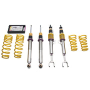Cutting-edge motorsports technology for more performance on the road. Like every suspension product developed by KW automotive, the suspension manufacturer, and manufactured in Germany, the KW V3 Coilover suspension kit also provides a significant plus in safety reserves in road traffic. Thanks to the chassis with its high-quality dampers, springs, and elastomer spring elements, pitching and rolling movements during load changes such as evasive maneuvers, cornering, acceleration, and braking are significantly reduced. The braking distances are also shortened. Thanks to improved support and feedback, drivers not only feel safer but driving in everyday life becomes even safer. With compression and rebound stage damping, that can be set separately and independently of each other, the damper setup can be customized to your personal driving preferences or vehicle changes such as weight, tire characteristics, or altered vehicle rigidity. True performance optimization is only possible with this unique, patented system. For example, this allows the compression damping force to be increased and get more grip from the tires, to improve cornering behavior and reduce squat without simultaneously altering the rebound stage damping which is optimally matched to the spring rate, a scenario which results in reduced grip and the associated loss of performance. The KW V3 coilover kit is the ideal tool for performance-oriented drivers and experienced tuning enthusiasts who place a strong emphasis on the overall performance of their suspension. The Variant 3 features patented TVR-A and TVC-A technology that provides separately adjustable rebound and compression damping. The extensive adjustment range of the independently configurable rebound and compression make it easy to directly influence the steering behavior, directional stability, grip and handling characteristics for confident and repeatable results at the limit of driving dynamics.