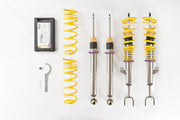 Cutting-edge motorsports technology for more performance on the road. Like every suspension product developed by KW automotive, the suspension manufacturer, and manufactured in Germany, the KW V3 Coilover suspension kit also provides a significant plus in safety reserves in road traffic. Thanks to the chassis with its high-quality dampers, springs, and elastomer spring elements, pitching and rolling movements during load changes such as evasive maneuvers, cornering, acceleration, and braking are significantly reduced. The braking distances are also shortened. Thanks to improved support and feedback, drivers not only feel safer but driving in everyday life becomes even safer. With compression and rebound stage damping, that can be set separately and independently of each other, the damper setup can be customized to your personal driving preferences or vehicle changes such as weight, tire characteristics, or altered vehicle rigidity. True performance optimization is only possible with this unique, patented system. For example, this allows the compression damping force to be increased and get more grip from the tires, to improve cornering behavior and reduce squat without simultaneously altering the rebound stage damping which is optimally matched to the spring rate, a scenario which results in reduced grip and the associated loss of performance. The KW V3 coilover kit is the ideal tool for performance-oriented drivers and experienced tuning enthusiasts who place a strong emphasis on the overall performance of their suspension. The Variant 3 features patented TVR-A and TVC-A technology that provides separately adjustable rebound and compression d amping. The extensive adjustment range of the independently configurable rebound and compression make it easy to directly influence the steering behavior, directional stability, grip and handling characteristics for confident and repeatable results at the limit of driving dynamics.