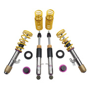 Cutting-edge motorsports technology for more performance on the road. Like every suspension product developed by KW automotive, the suspension manufacturer, and manufactured in Germany, the KW V3 Coilover suspension kit also provides a significant plus in safety reserves in road traffic. Thanks to the chassis with its high-quality dampers, springs, and elastomer spring elements, pitching and rolling movements during load changes such as evasive maneuvers, cornering, acceleration, and braking are significantly reduced. The braking distances are also shortened. Thanks to improved support and feedback, drivers not only feel safer but driving in everyday life becomes even safer. With compression and rebound stage damping, that can be set separately and independently of each other, the damper setup can be customized to your personal driving preferen ces or vehicle changes such as weight, tire characteristics, or altered vehicle rigidity. True performance optimization is only possible with this unique, patented system. For example, this allows the compression damping force to be increased and get more grip from the tires, to improve cornering behavior and reduce squat without simultaneously altering the rebound stage damping which is optimally matched to the spring rate, a scenario which results in reduced grip and the associated loss of performance. The KW V3 coilover kit is the ideal tool for performance-oriented drivers and experienced tuning enthusiasts who place a strong emphasis on the overall performance of their suspension. The Variant 3 features patented TVR-A and TVC-A technology that provides separately adjustable rebound and compression damping. The extensive adjustment range of the independently configurable rebound and compression make it easy to directly influence the steering behavior, directional stability, grip and handling characteristics for confident and repeatable results at the limit of driving dynamics.