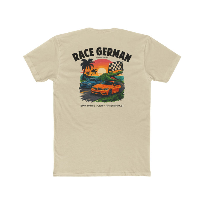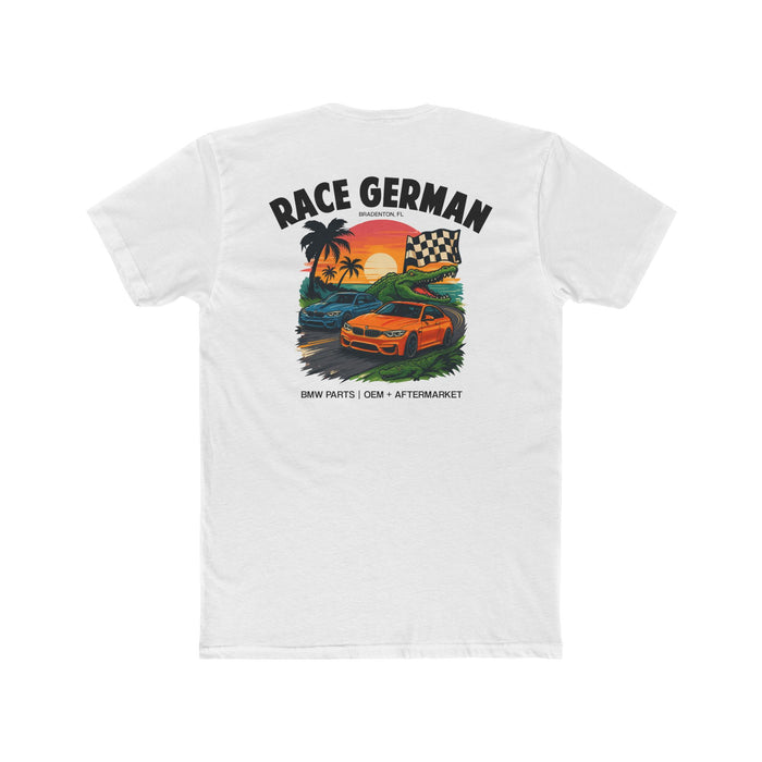 Rev into Florida vibes with this new tee! Featuring two fierce BMW F82 M3s battling it out under a glowing sunset sky, this shirt screams high-octane fun. Completing the Floridian flair, a bold gator proudly waves the checkered flag, because nothing says Florida racing quite like speed, sunsets, and alligators. Perfect for enthusiasts who live life in the fast lane, Sunshine State style!